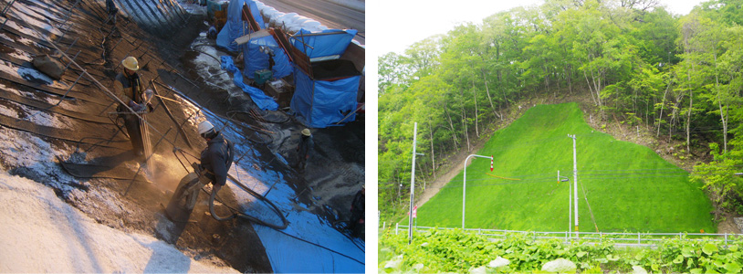 地山の変形に伴う補強材の抵抗力によりのり面・斜面を安定させます。吹付や吹付枠と併用されることが多かったが、環境面を配慮した全面緑化が可能な受圧板や連続繊維補強土と用いられることが増えています。