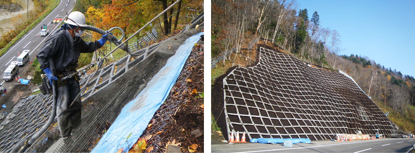 連続繊維補強土は、砂質土とポリエステル製の繊維材料をジェット水とともに噴射し、耐侵食性と見かけの粘着力を増加させた土留め擁壁やのり面保護などの構造物を築造します。断熱効果が高く変形追従性に優れるため、凍上性地盤にも効果的です。