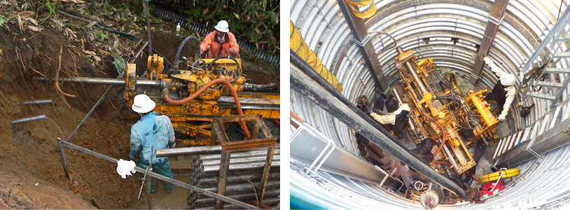 地山の地下水位が高く、切土によるすべりを起こす場合や地山変状が生じている場合の地下水位低下対策として、主に横ボーリングが用いられています。